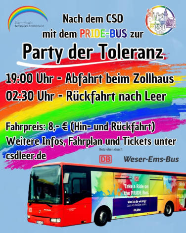 Das CSD Orga-Team aus Leer hat den Shuttle „Pride Bus“ über Weser-Ems Bus zur „Party der Toleranz“ für den 12. Juli 2025 organisiert. Nachdem der CSD Leer offiziel beendet ist, geht‘s mit dem „Pride Bus“ zur Party.Es gibt 44 Sitz- und 30 Stehplätze.Der Startpunkt ist ab Zollhaus, Bahnhofsring 4, 26789 Leer ab 19:00 Uhr und es wird Zwischenstopps auf der Route geben. Rückfahrt ist gegen ca. 02:30 Uhr geplant.Der Ticketpreis für die Hin- und Rückfahrt beträgt 8 € (auch bei einfacher Strecke).Hier Ticket für Party Shuttle zur "Party der Toleranz" online bestellen.Fahrplan Hinweg19:00 Uhr - Abfahrt in Leer (Zollhaus)19:25 Uhr - Halt Holterfehn (Hotel Meyerhoff)19:40 Uhr - Halt Barßel (Hafen)19:55 Uhr - Halt Ocholt (Bahnhof)20:00 Uhr Ankunft Torsholt (Gasthof Dierks)Fahrplan Rückweg02:30 Uhr Abfahrt in Torsholt (Gasthof Dierks)02:35 Uhr - Halt Ocholt (Bahnhof)02:50 Uhr - Halt Barßel (Hafen)03:05 Uhr - Halt Holterfehn (Hotel Meyerhoff)03:30 Uhr - Ankunft in Leer (Zollhaus)